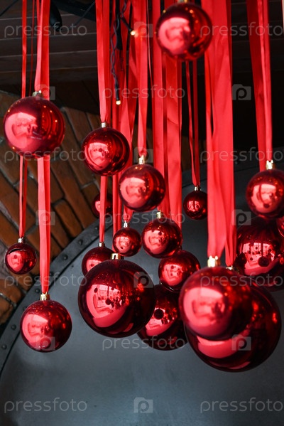 Новогоднее украшение на улице города. красные елочные шары на лентах. Фото высокого качества