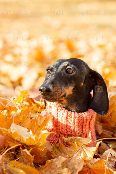Портрет таксы в опавших листьях осеннего парка в солнечный день