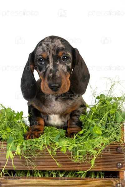 Любопытный мраморный щенок таксы сидит в корзине с зеленой травой на белом фоне студии