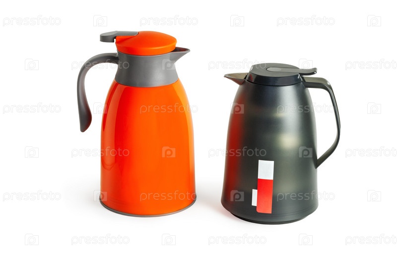 Темно-зеленый и оранжевый термос. Крупный план. Изолированные на белом фоне