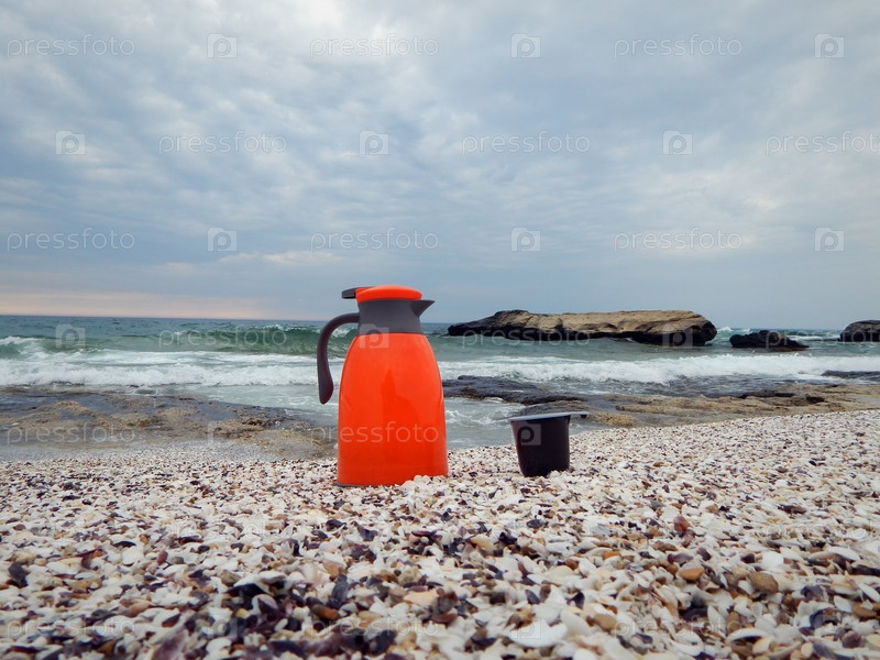 Оранжевый термос на берегу