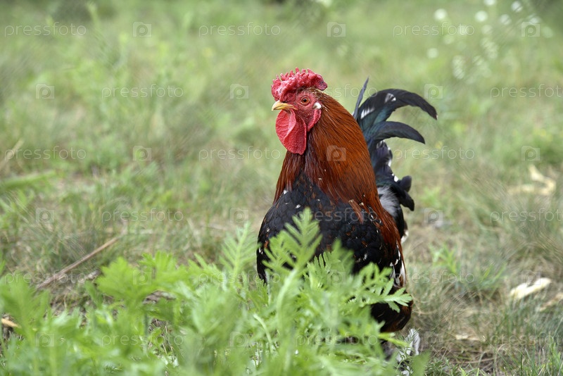 Красный и черный петух на зеленой траве. Домашний петух в саду