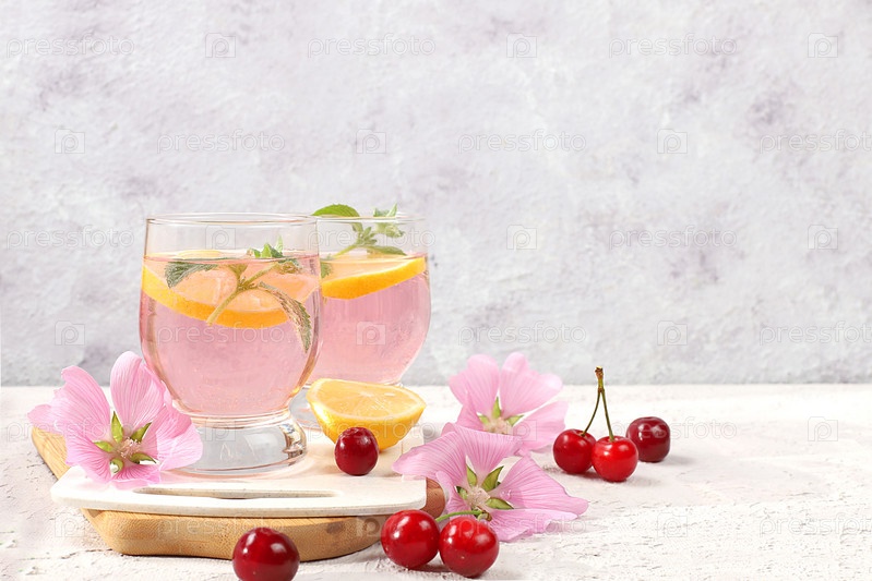 Вишневый чай со льдом или коктейль из мяты и лимона — рецепт освежающего летнего напитка. Стакан с яблочным фруктовым лимонадом на светлом бетонном столе, детокс-диета и концепция похудения, меню ресторана, выборочный фокус