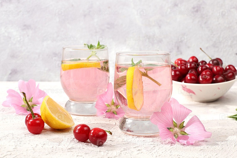 Вишневый чай со льдом или коктейль из мяты и лимона — рецепт освежающего летнего напитка. Стакан с яблочным фруктовым лимонадом на светлом бетонном столе, детокс-диета и концепция похудения, меню ресторана, выборочный фокус