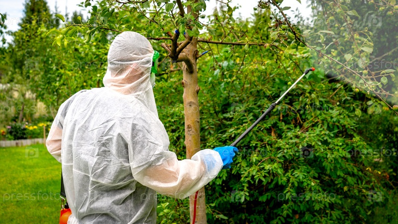 Фермер в защитном костюме опрыскивает фруктовые деревья в саду