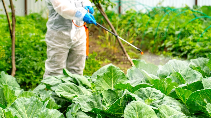 Фермер опрыскивает капусту инсектицидами и химикатами