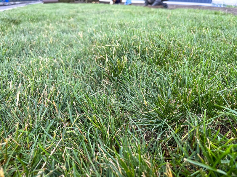 Укладка рулонного газона, благоустройство заднего двора, крупный план газона