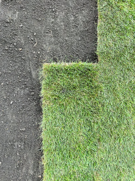 Укладка рулонного газона, благоустройство заднего двора, крупный план газона