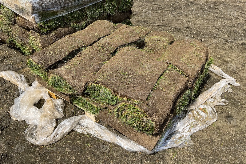 Укладка рулонного газона, благоустройство заднего двора, крупный план газона