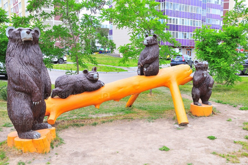 Медведь с медвежатами в городе Руза в виде деревянных скульптур в городском сквере