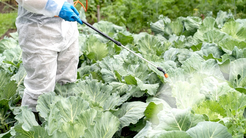 Фермер опрыскивает капусту инсектицидами и химикатами