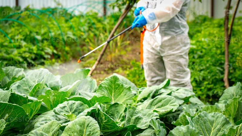 Фермер опрыскивает капусту инсектицидами и химикатами