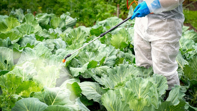 Фермер опрыскивает капусту инсектицидами и химикатами