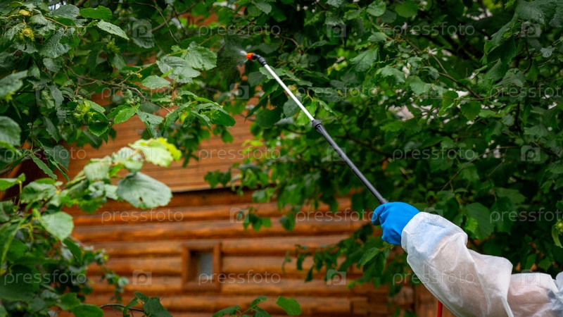 Фермер в защитном костюме опрыскивает фруктовые деревья в саду