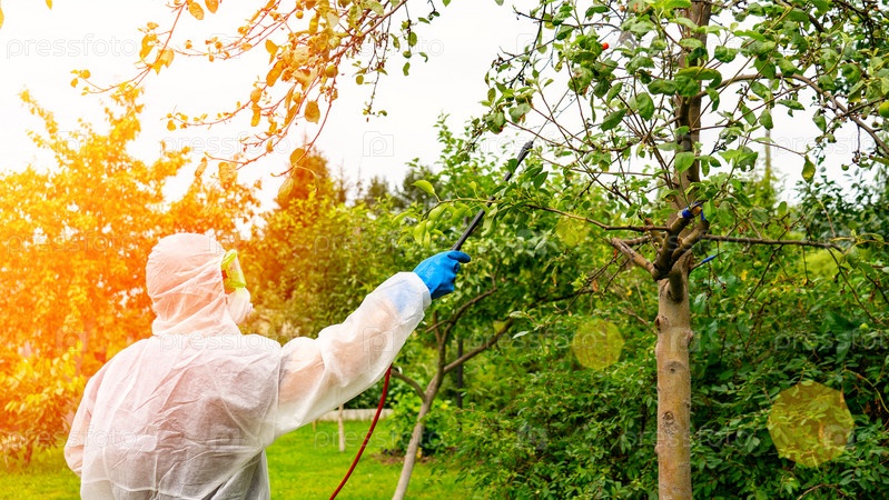 Фермер в защитном костюме опрыскивает фруктовые деревья в саду