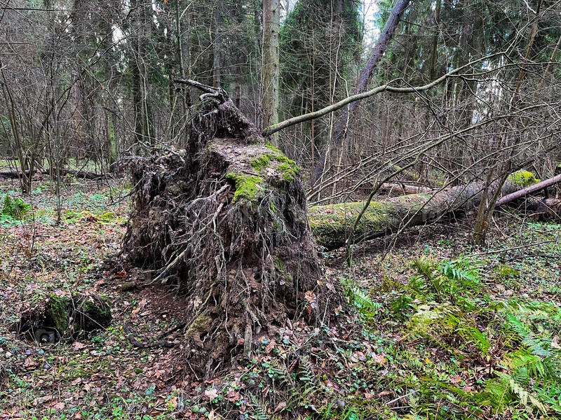 Упавшее дерево в лесу после шторма. Дерево вырвано с корнем сильным ветром