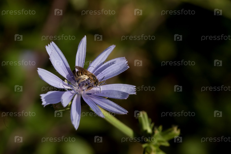 Растение (Cichorium) с голубыми цветами и крупным планом пчелы