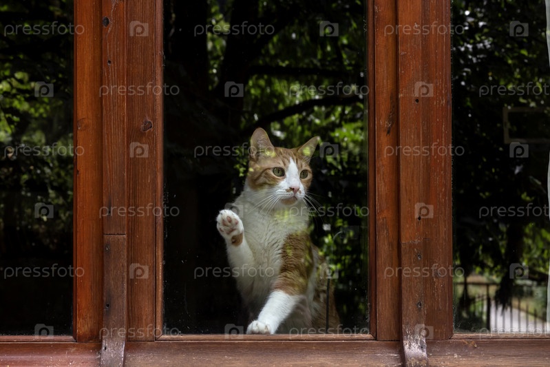 Рыжий кот за окном поднял лапу крупным планом