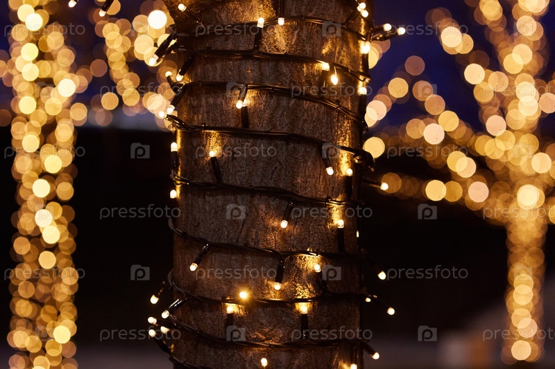 Блики и боке от гирлянды лампочек, висящих на дереве