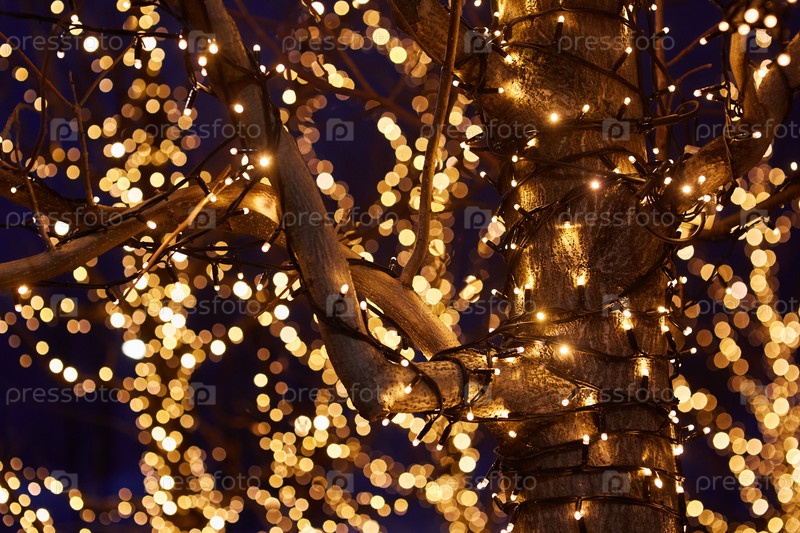 Блики и боке от гирлянды лампочек, висящих на дереве