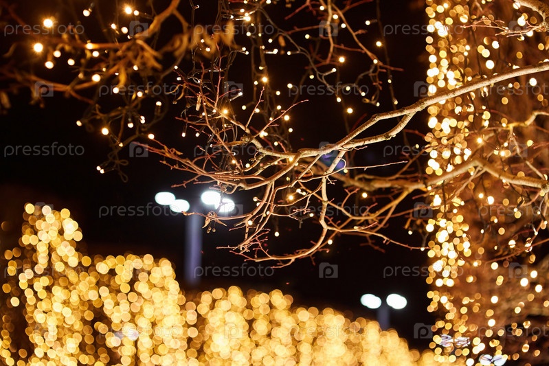 Блики и боке от гирлянды лампочек, висящих на дереве