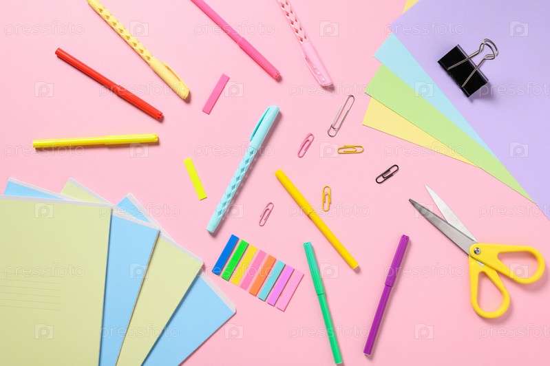 Вернуться к школьной концепции. канцелярские товары для школы на розовом фоне. Вид сверху