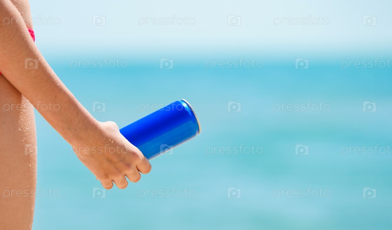 Девушка держит в руке синюю банку с холодным напитком на фоне моря. Копирование пространства, крупный план