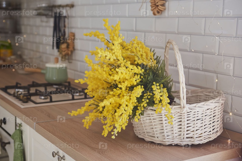 Весенние цветы мимозы в белой корзине на кухне. Дизайн интерьера
