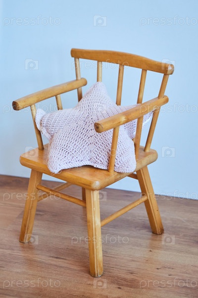 Деревянный стульчик для детей. На сиденье есть розовая подушка. Дизайн интерьера для детей