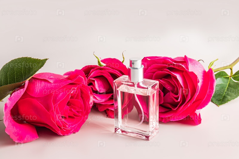 Флакон духов из прозрачного стекла на фоне красивых бутонов красных роз. шаблон для духов и туалетной воды