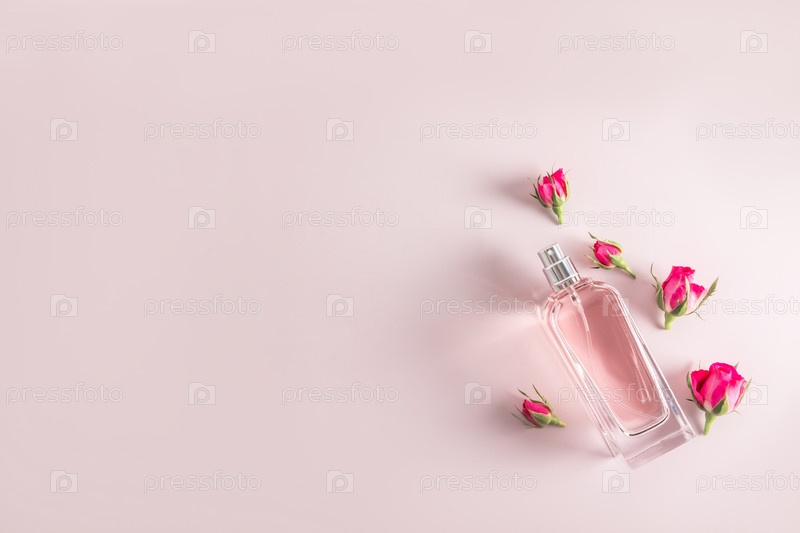 Шикарная хрустальная бутылка косметического спрея или женских духов на розовом фоне с маленькими бутонами розовых роз. место для текста. Вид сверху