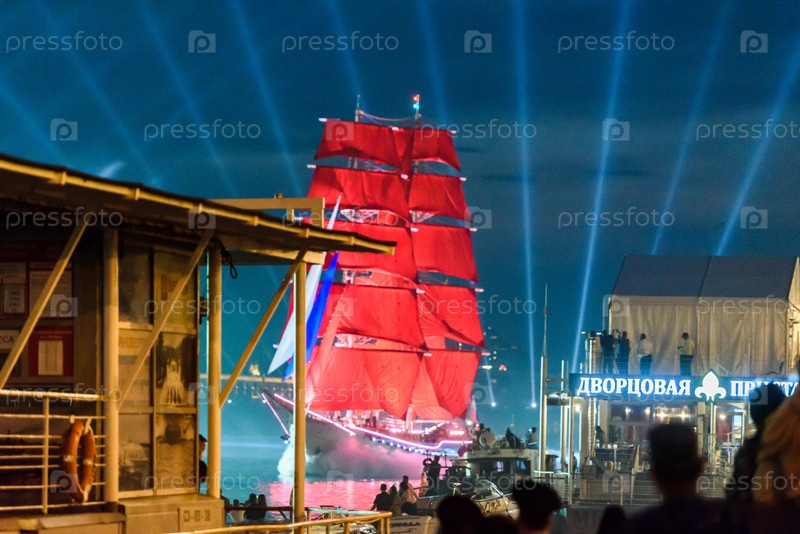Россия, Санкт-Петербург, июнь 2021 г.: Ночной вид на Дворцовый мост. Алые паруса