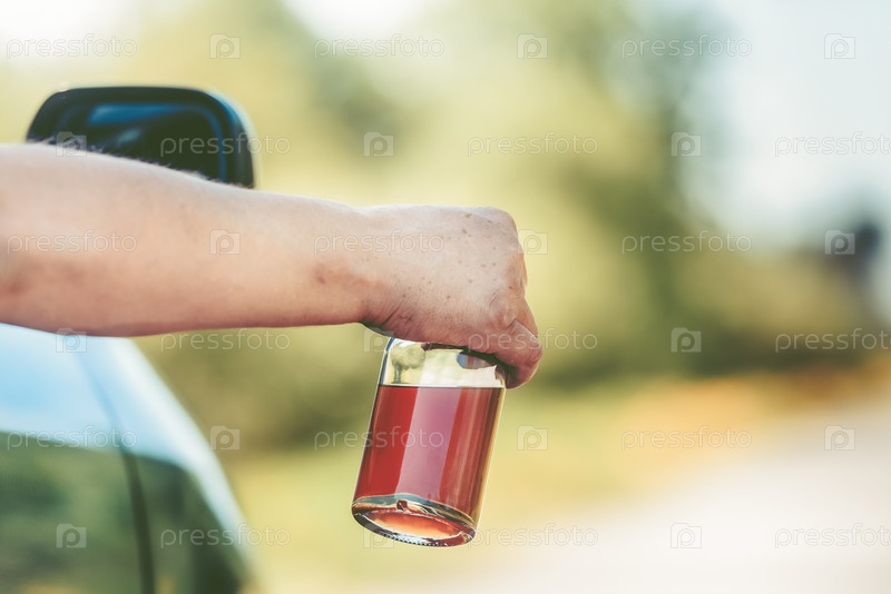 Алкоголь, бутылка и машина - концепция не пить за рулем. Мужчина пьет алкоголь за рулем. Тонированный