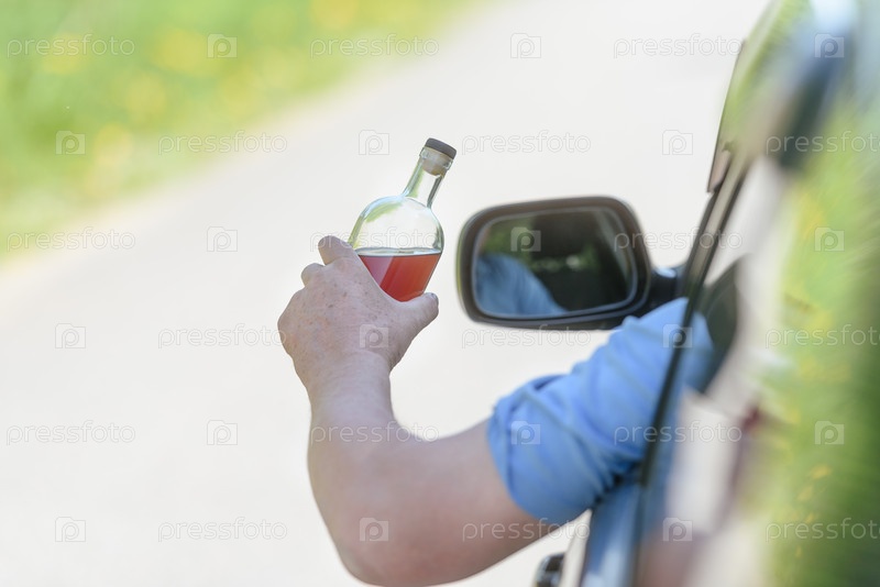 Алкоголь, бутылка, автомобиль и концепция вождения в нетрезвом виде - человек держит в руке бутылку с алкогольным напитком, управляя автомобилем
