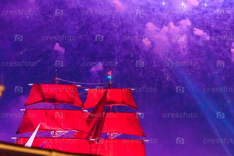 Россия, Санкт-Петербург, июнь 2021 г.: Ночной вид на Дворцовый мост. Алые паруса