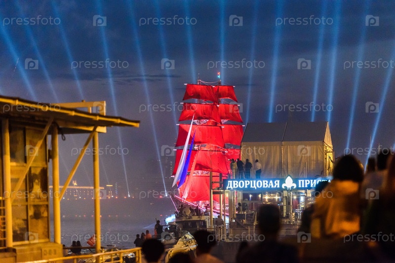 Россия, Санкт-Петербург, июнь 2021 г.: Ночной вид на Дворцовый мост. Алые паруса