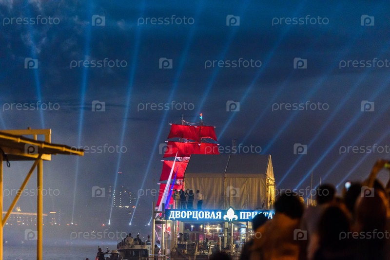 Россия, Санкт-Петербург, июнь 2021 г.: Ночной вид на Дворцовый мост. Алые паруса