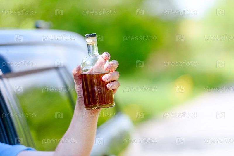 Алкоголь, бутылка, автомобиль и концепция вождения в нетрезвом виде - человек держит в руке бутылку с алкогольным напитком, управляя автомобилем. Тонированный