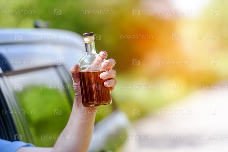 Алкоголь, бутылка, автомобиль и концепция вождения в нетрезвом виде - человек держит в руке бутылку с алкогольным напитком, управляя автомобилем. Тонированный