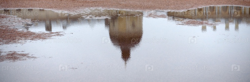 Отражение Гатчинского дворца в лужах - панорамный вид