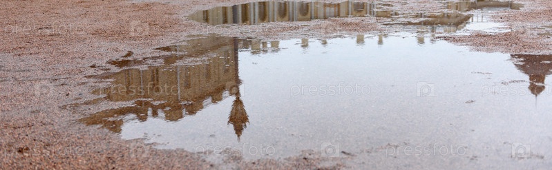 Отражение Гатчинского дворца в лужах - панорамный вид