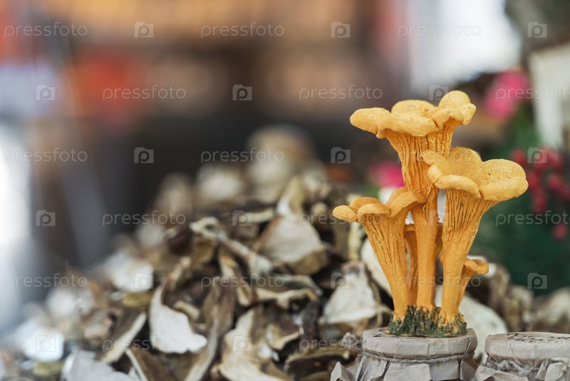 Сушеные грибы на прилавке на рынке крупным планом