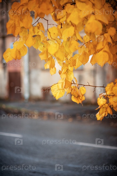 Ветка дерева с желтыми осенними листьями в городе