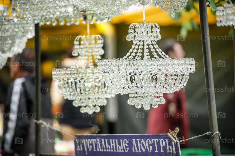 Россия, Гатчина, 20 июня 2022 г.: Хрустальные люстры продаются на уличном рынке