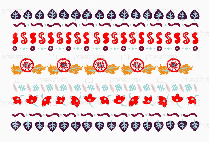 Набор этнических элементов. Бордюр представляет собой полосу с цветами, листьями, ветками, вензелями. Народная вышивка. Славянский, украинский, русский мотив. Хохлома, матрешка, дымковская игрушка. Мексиканский, индийский, цыганский ковер. Вязаное кружево