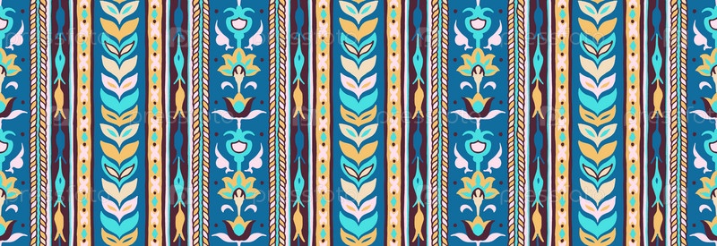 Геометрический дамасский орнамент. Икат границы. Этническая вышивка с листьями и монограммами. Племенная векторная текстура. Бесшовный народный узор в ацтекском стиле. Индийский, скандинавский, цыганский, мексиканский, африканский ковер