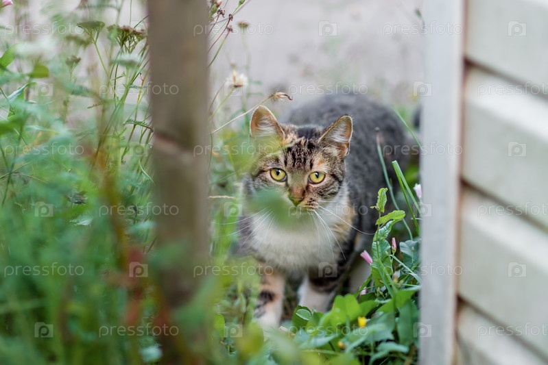 Уличный кот смотрит в камеру из кустов