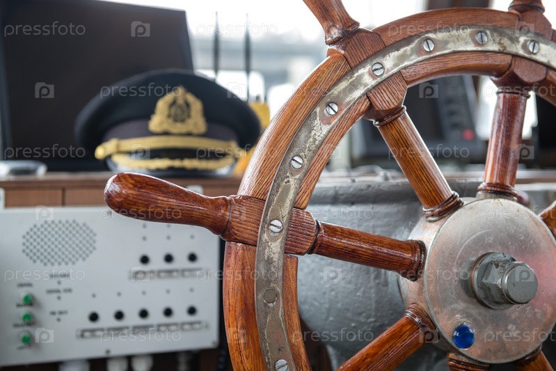 Россия, Санкт-Петербург, 14 сентября 2022 г.: Рулевое колесо в каюте капитана