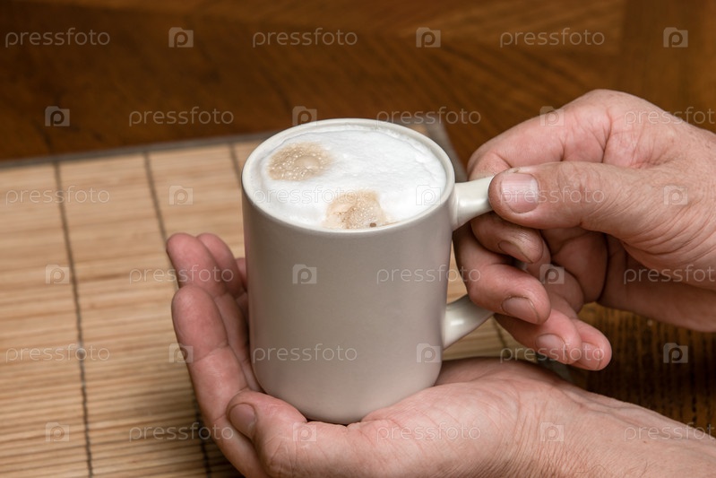 Чашка свежего кофе с пеной капучино в руках мужчины крупным планом