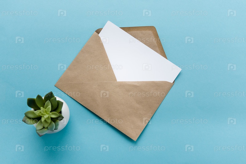 Конверт из крафт-бумаги и белая пустая открытка на синем фоне. Подготовка открытки